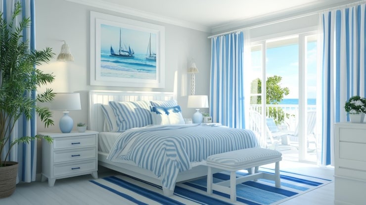 White and sky blue are refreshing and calming and the effect of the two colors is a beach-like serenity that is ideal for relaxing.