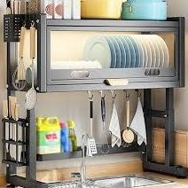 - To keep your countertop clean and clear, install a dish rack with a drain tray in the space above the sink.