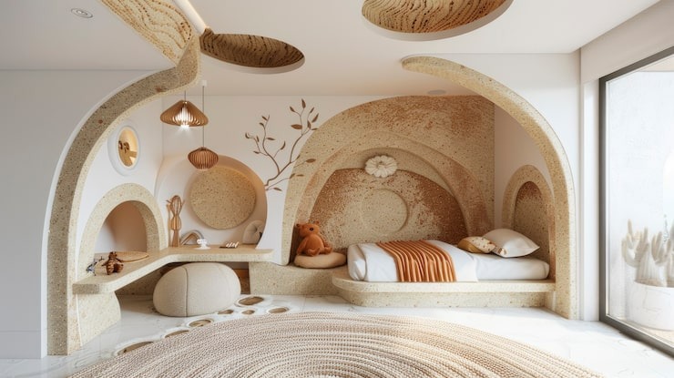 • Geometric Patterns: Geometric wallpapers, carpets or baseboard designs provide structure and depth. Walls, floors and even ceilings can be visually stimulating with the use of triangles, hexagons, or abstract grids.