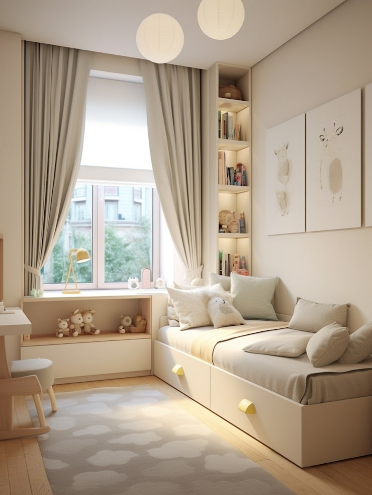 Quartier Studio recommendation: Neutral carpet and curtains will allow easier changes in future décor.